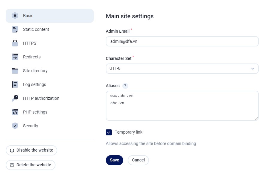 Các bạn đăng nhập vào Fastpanel, tìm đến domain cần tạo Aliases, chọn mục Setting => Basic. Sau đó điền tên domain Alias vào input Aliases